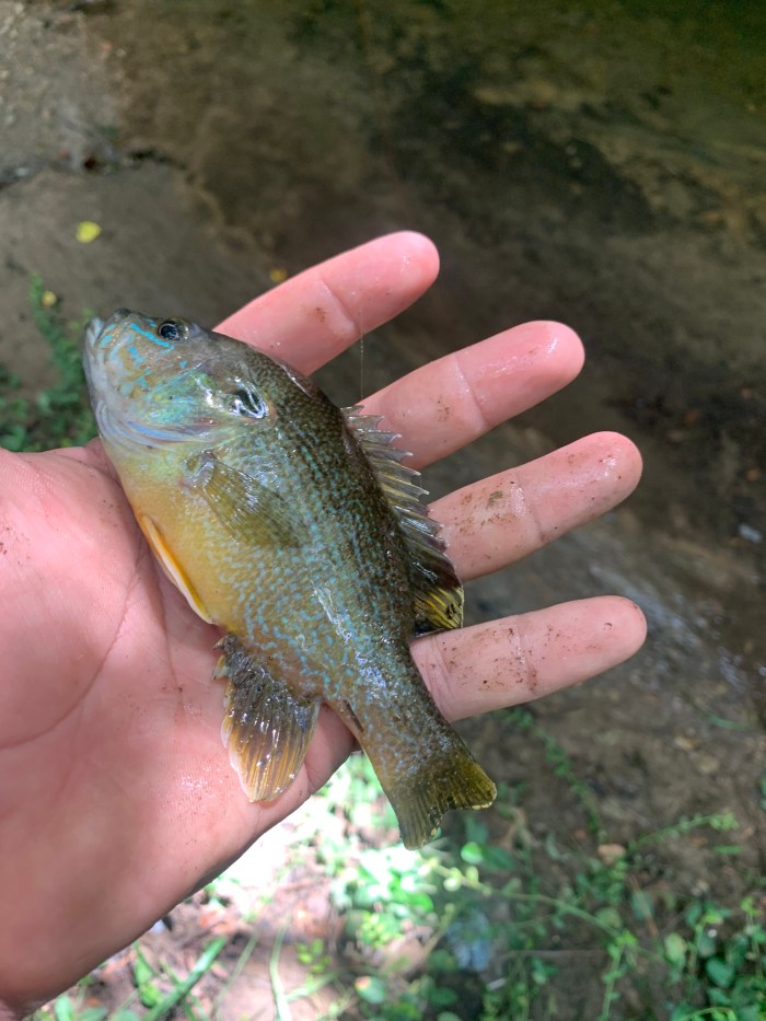 The Fishing: As soon as the fly hit the water, the fish were on it. In clear water, watching sunfish attack a fly is something even the snooty fisherman will enjoy. They would swim to the fly, then hesitate and investigate. A couple of gentle taps on the rod with one finger would get the soft hackles on the fly slightly moving. In a quick flash, the fish would have the fly in its mouth and head for cover. Hooking small sunfish can be tricky. Once hooked though, the fight was impressive. Although these are small fish, these are healthy, predatory fish in their natural environment, ready to battle. Making multiple runs across the creek, upstream, downstream, and toward cover, catching these fish on a light, flexible rod was great fun. All fish caught were released unharmed.