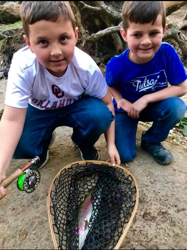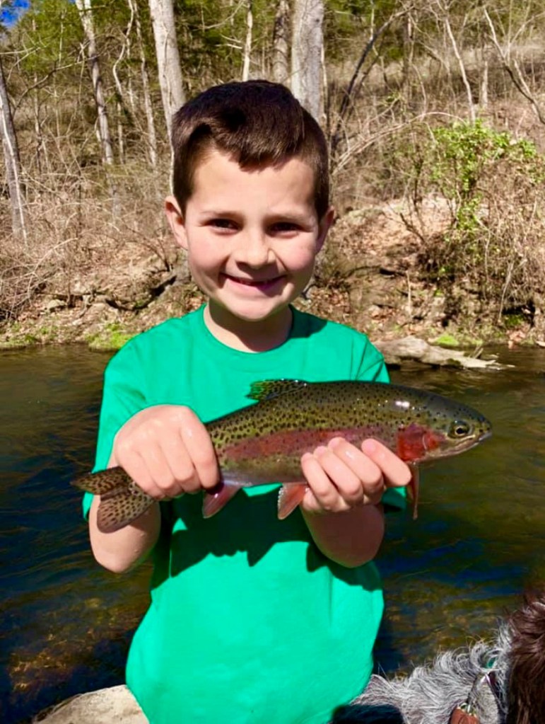 The Gear: While I am always an advocate of light tackle and simple methods, I do make an exception in this case. When fishing Dry Run Creek, I don’t want to harm the fish. While you can catch a large fish on light tackle, there may be a 10 minute battle that will end up exhausting and killing the fish. I have my kids fish 4-5 weight rods. The youngest has an Orvis Clearwater 5 weight setup that I bought in 2004, and the oldest uses a Sage 5 weight. Both these are fun for smaller fish, yet are perfectly capable of handling bigger fish. We usually use 3x or 4x leaders and tippet. For flys, olive sowbugs, small wooly buggers, san juan worms, zebra midges, and most small soft hackle flies will produce. These fish are smart and receive a lot of fishing pressure. We have found that switching flies after catching a fish is productive. Lastly, stop by Two Rivers Fly Shop in Norfork or Dally’s Ozark Fly Fisher in Cotter on your way to the creek. They will tell you the latest reports from the creek, tell you what flies are working, and they will also tell your kids about giant fish that were recently caught in the creek to get your kids excited.